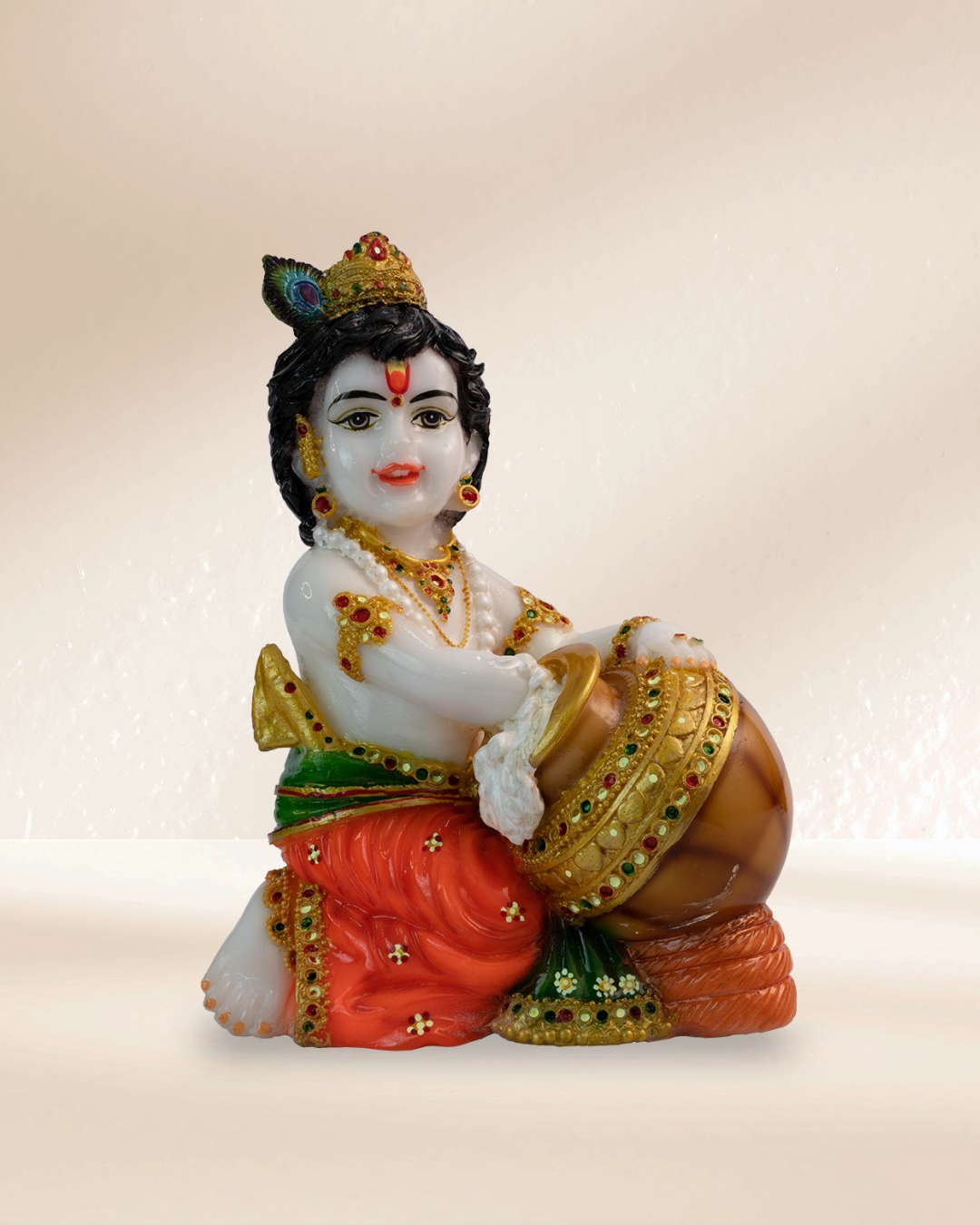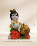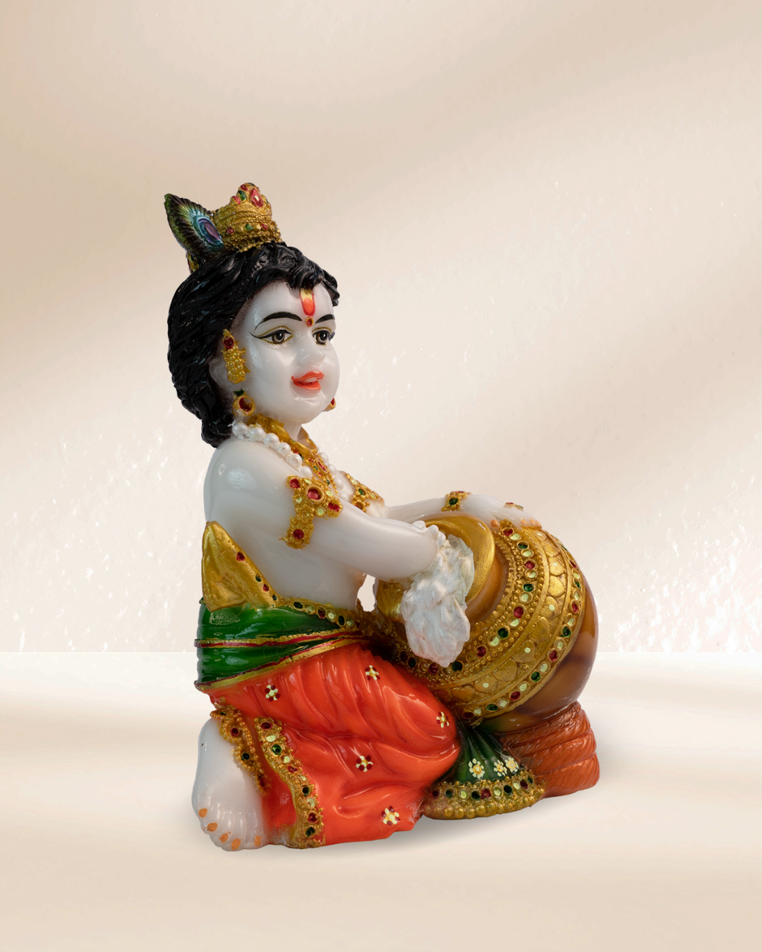 This beautifully crafted composite idol features Bal Gopal in a playful pose, kneeling beside a butter pot with butter spilling over. Detailed with vibrant hand-painted colors and intricate golden accents, the idol perfectly captures the cheerful and charming presence of little Krishna. Ideal for your puja space, home decor, or as a thoughtful gift for any special occasion.