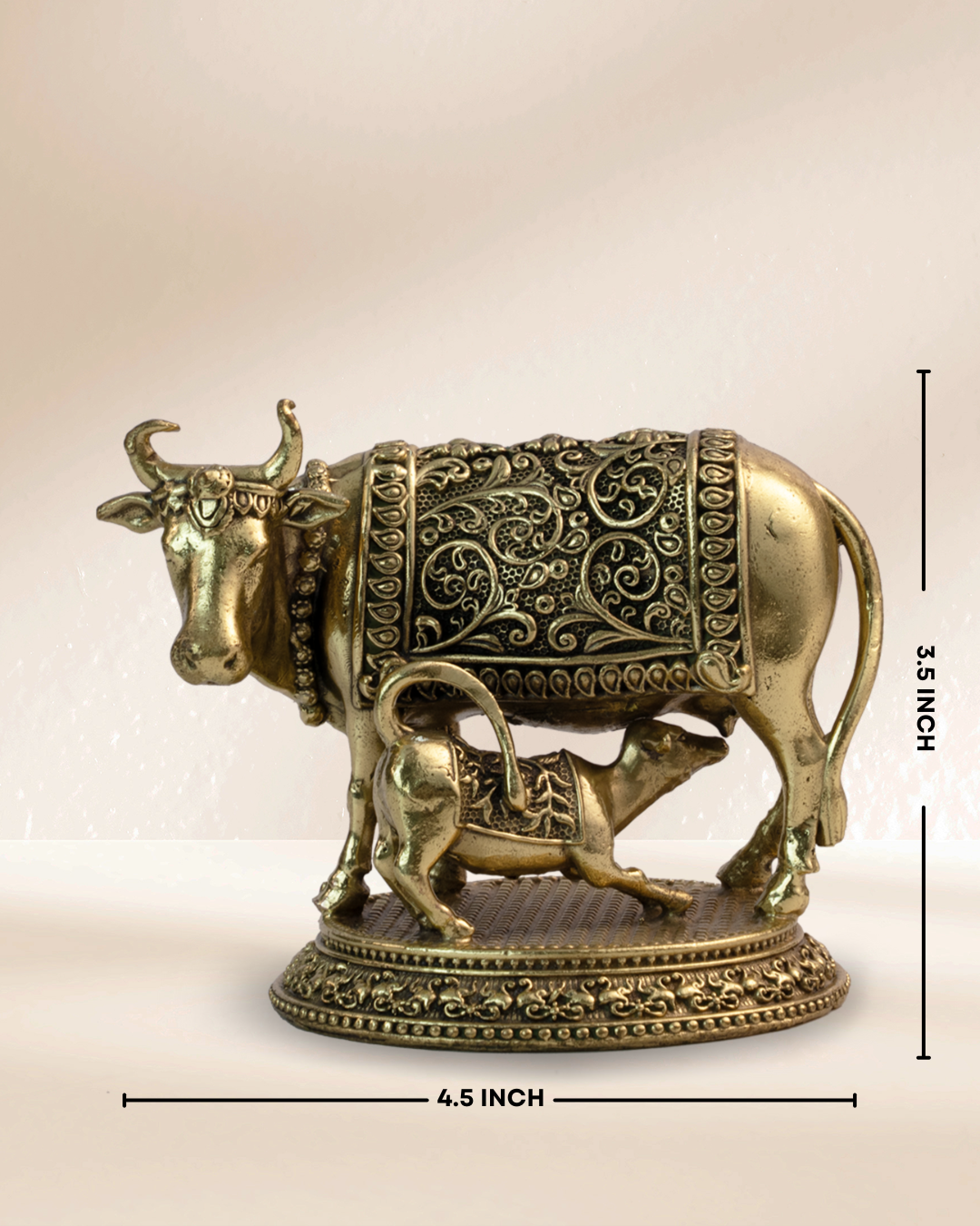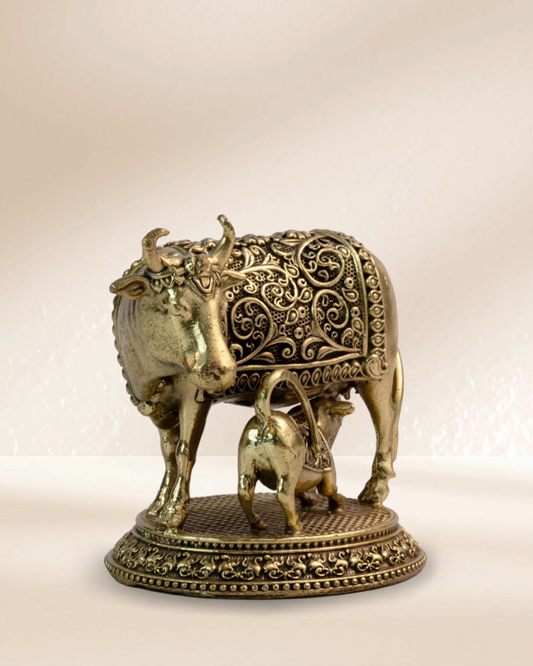This beautifully crafted ashtadhatu idol features Gau Mata with her calf, symbolizing love, care, and prosperity. The detailed design reflects purity and blessings, making it perfect for your pooja room, home décor, or gifting on special occasions.