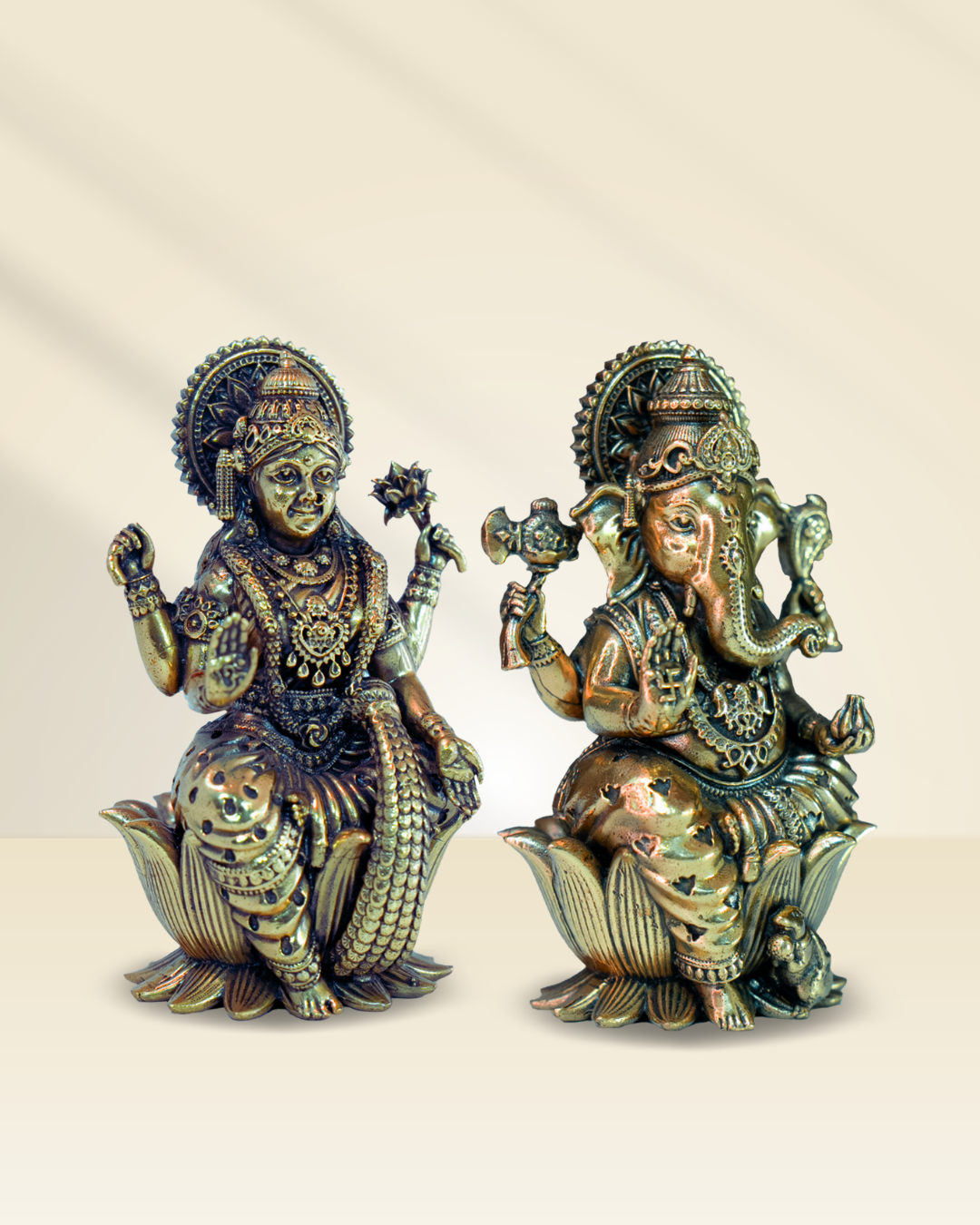 This beautifully crafted Ashtadhatu idol set features Goddess Laxmi and Lord Ganesha seated on a lotus, symbolizing prosperity, wisdom, and good fortune. Designed with intricate details, the idols capture the essence of blessings and abundance. Perfect for your puja space, home decor, or as a thoughtful gift for any spiritual occasion.
