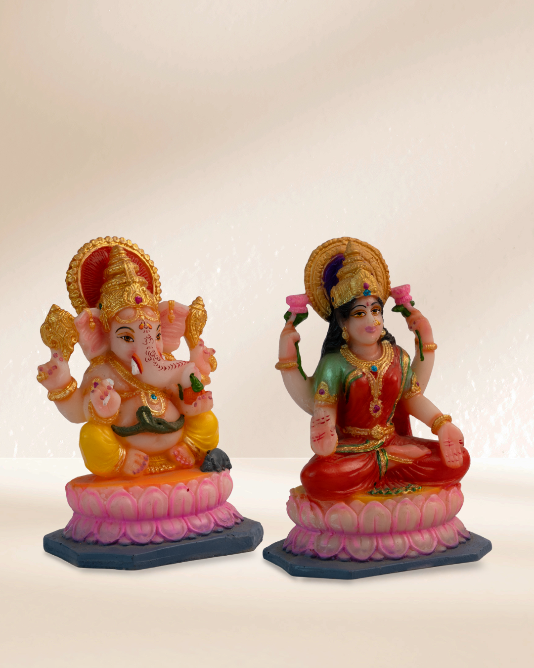 This beautifully crafted composite marble idol set features Maa Laxmi and Lord Ganesh, both gracefully seated on lotus bases. The set represents prosperity, good fortune, and wisdom, making it ideal for your pooja space, home décor, or as a thoughtful gift for festive occasions.
