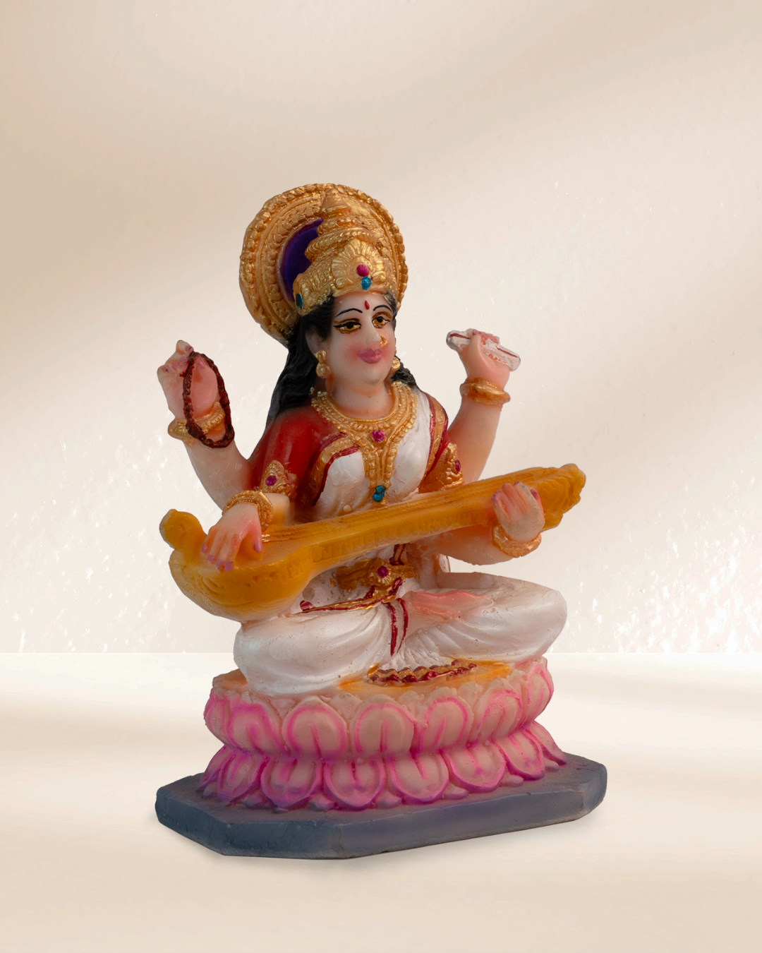 This beautifully crafted composite idol features Saraswati Maa seated gracefully on a lotus, holding a veena in her hands. Detailed with vibrant hand-painted colors, the idol perfectly captures the calm and elegant presence of the Goddess of knowledge, music, and arts. Ideal for your puja space, home decor, or as a thoughtful gift for any special occasion.